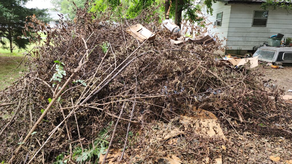 Part of a growing pile of brush from around the yard, along with some trash thrown on it.  Would have liked mulching the brush up but don’t have a mulcher, so had to take my time and slowing burn some at a time.  Just the beginning.