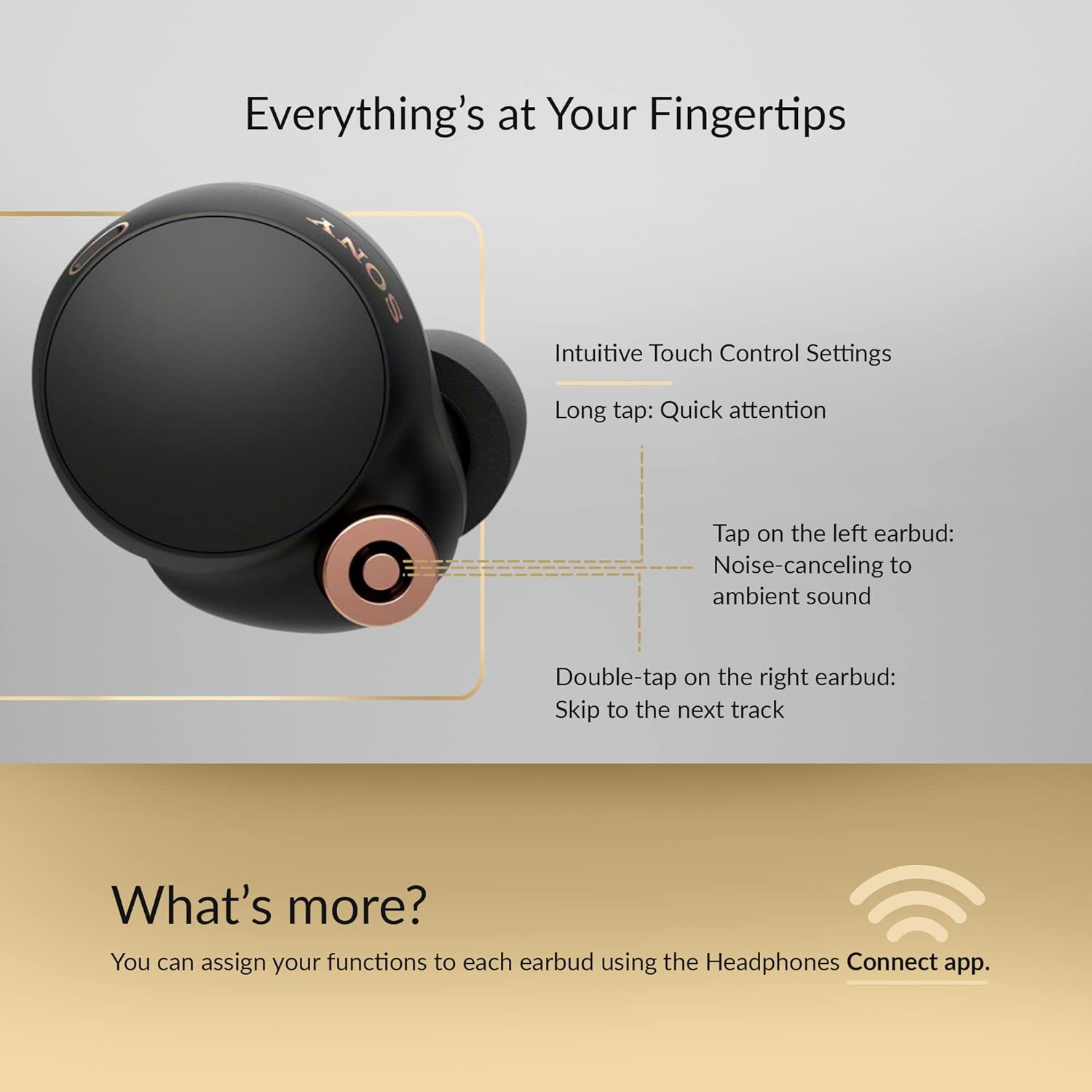 - Everything’s at Your Fingertips: The WF-1000XM4 headphones feature intuitive touch control settings – for example, tap on the left earbud to change from Noise Canceling to Ambient Sound and long tap for Quick Attention, or double-tap on the right to skip to the next track. What’s more, you can assign your functions to each earbud using the Headphones Connect app