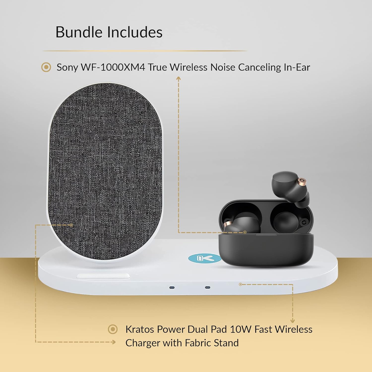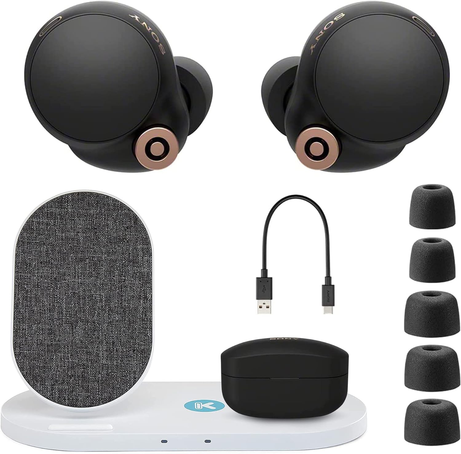 - Bundle Includes: Sony WF-1000XM4 True Wireless Noise Canceling In-Ear Headphones (Black) and Dual Pad 10W Fast Wireless Charger with Fabric Stand
