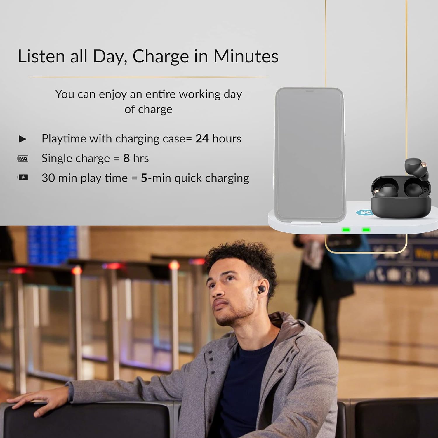 - Listen all Day, Charge in Minutes: You can enjoy a full working day of charge – 8 hours – from your Bluetooth earbuds and store another 16 hours in the case. That means a full 24 hours of listening time every time you leave the house. In a hurry? Just a 5-minute quick charge gives you up to 60 minutes of playtime