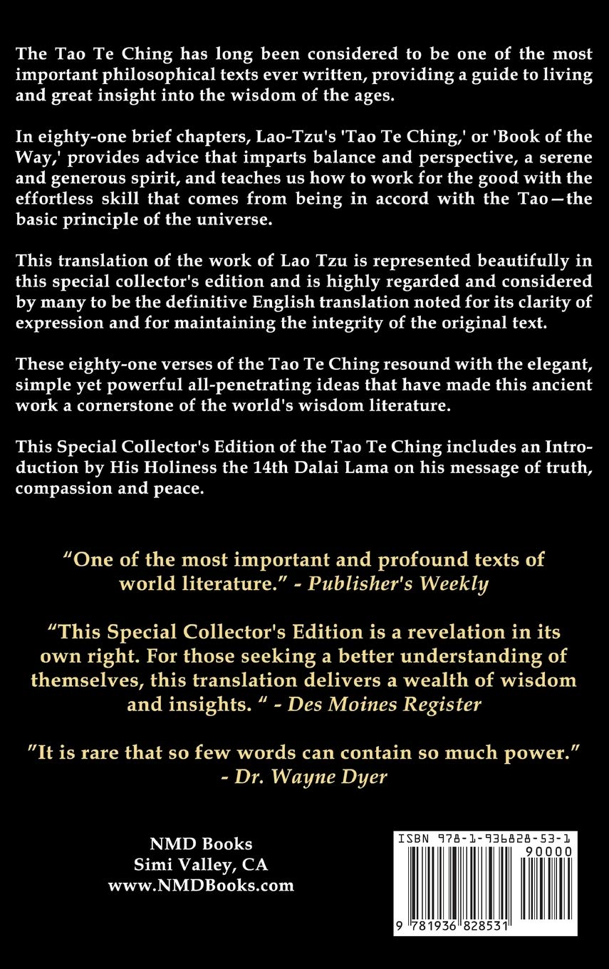 The Tao Te Ching has long been considered to be one of the most important philosophical texts ever written, providing a guide to living and great insight into the wisdom of the ages. In eighty-one brief chapters, Lao-Tzu’s ‘Tao Te Ching, ‘ or ‘Book of the Way, ‘ provides advice that imparts balance and perspective, a serene and generous spirit, and teaches us how to work for the good with the effortless skill that comes from being in accord with the Tao-the basic principle of the universe. This translation of the work of Lao Tzu is represented beautifully in this special collector’s edition and is highly regarded and considered by many to be the definitive English translation noted for its clarity of expression and for maintaining the integrity of the original text. These eighty-one verses of the Tao Te Ching resound with the elegant, simple yet powerful all-penetrating ideas that have made this ancient work a cornerstone of the world’s wisdom literature. This Special Collector’s Edition of the Tao Te Ching includes an Introduction by His Holiness the 14th Dalai Lama on his message of truth, compassion and peace. REVIEWS: “One of the most important and profound texts of world literature.” – Publisher’s Weekly “This Special Collector’s Edition is a revelation in its own right. For those seeking a better understanding of themselves, this translation delivers a wealth of wisdom and insights. ” – Des Moines Register “It is rare that so few words can contain so much power.” – Dr. Wayne Dyer