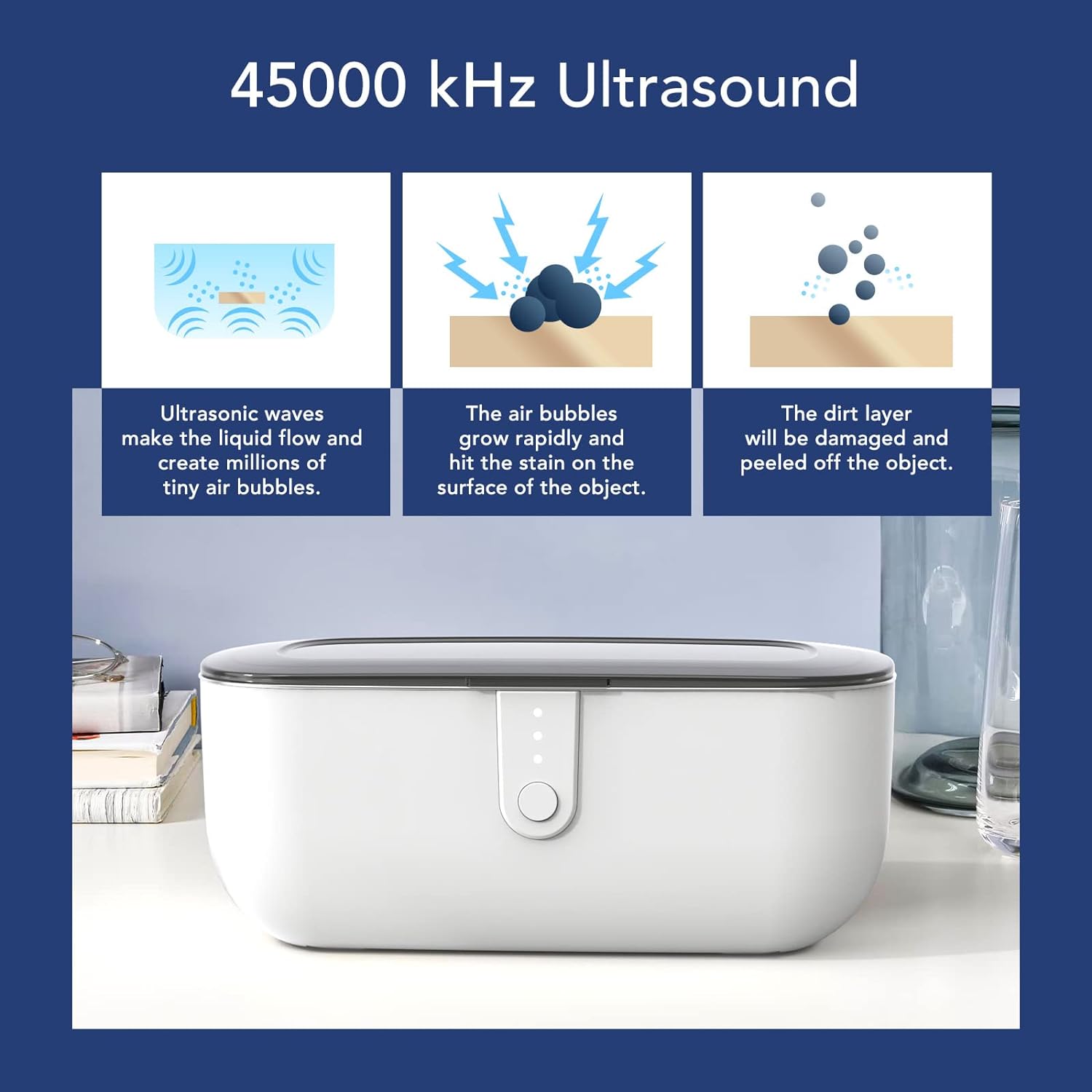 - 【EFFICIENTLY CLEANING】The ultrasonic cleaner generates 45,000 Hz of ultrasonic sound waves. Millions of tiny cleaning bubbles are generated during the cleaning process, which can attack and remove the most stubborn stains to achieve powerful and gentle cleaning. It won’t damage your valuables while refreshing them as new.