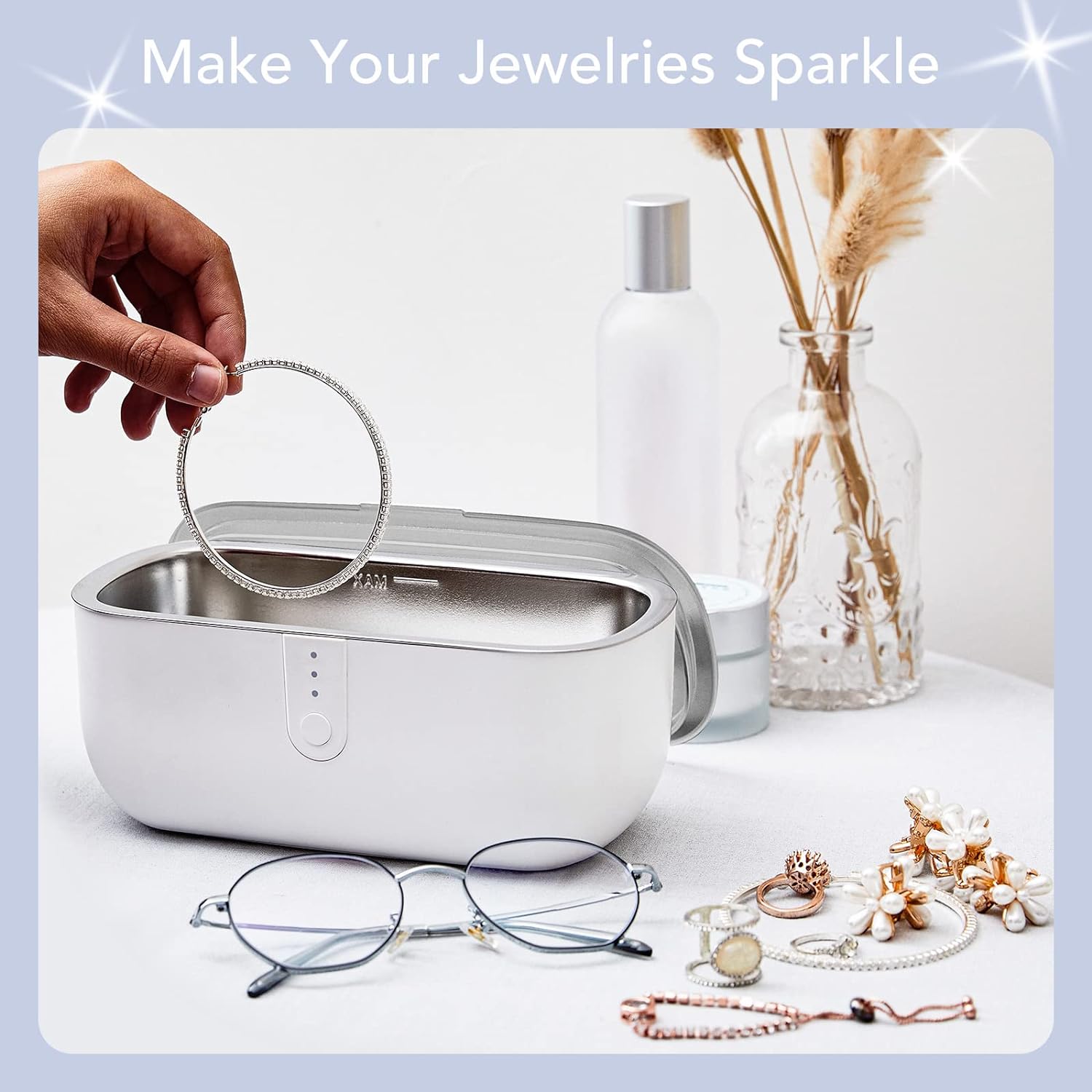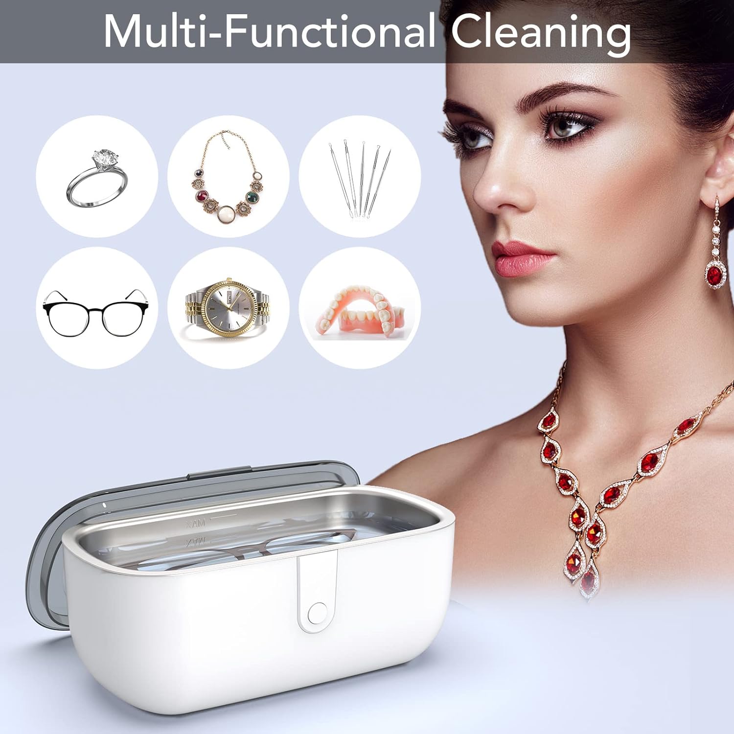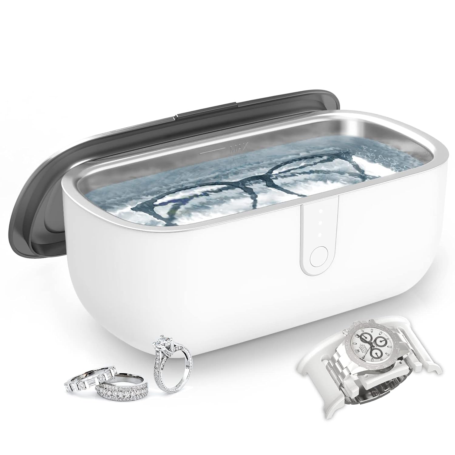 - 【MULTI-PURPOSE】This ring cleaner can be used to clean dirty jewelry, eyeglasses, watches, denture,coins and more in minutes using only tap water. Perfects for household or to travel, no need to clean your jewelry every time in the jewelry store. Using this cleaner, you will have a new pair of glasses every morning.